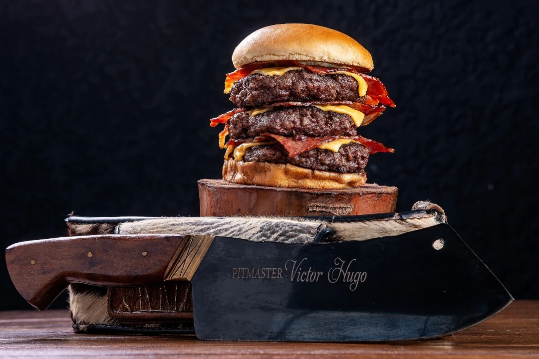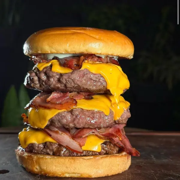 Pão brioche, nossa Brazanese, triplo hambúrguer de 150g, triplo queijo e triplo bacon. O verdadeiro O gigante que acaba com qualquer fome.