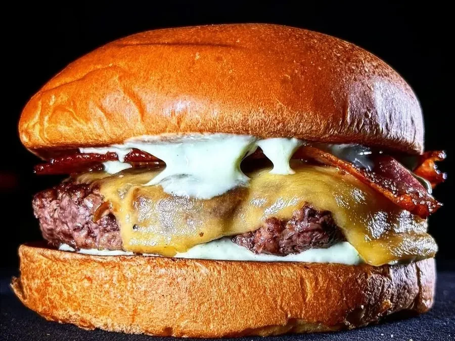 Blend bovino 80g no mais macio e fresco pão brioche selado e acompanhado de duplo queijo cheddar e maionese.